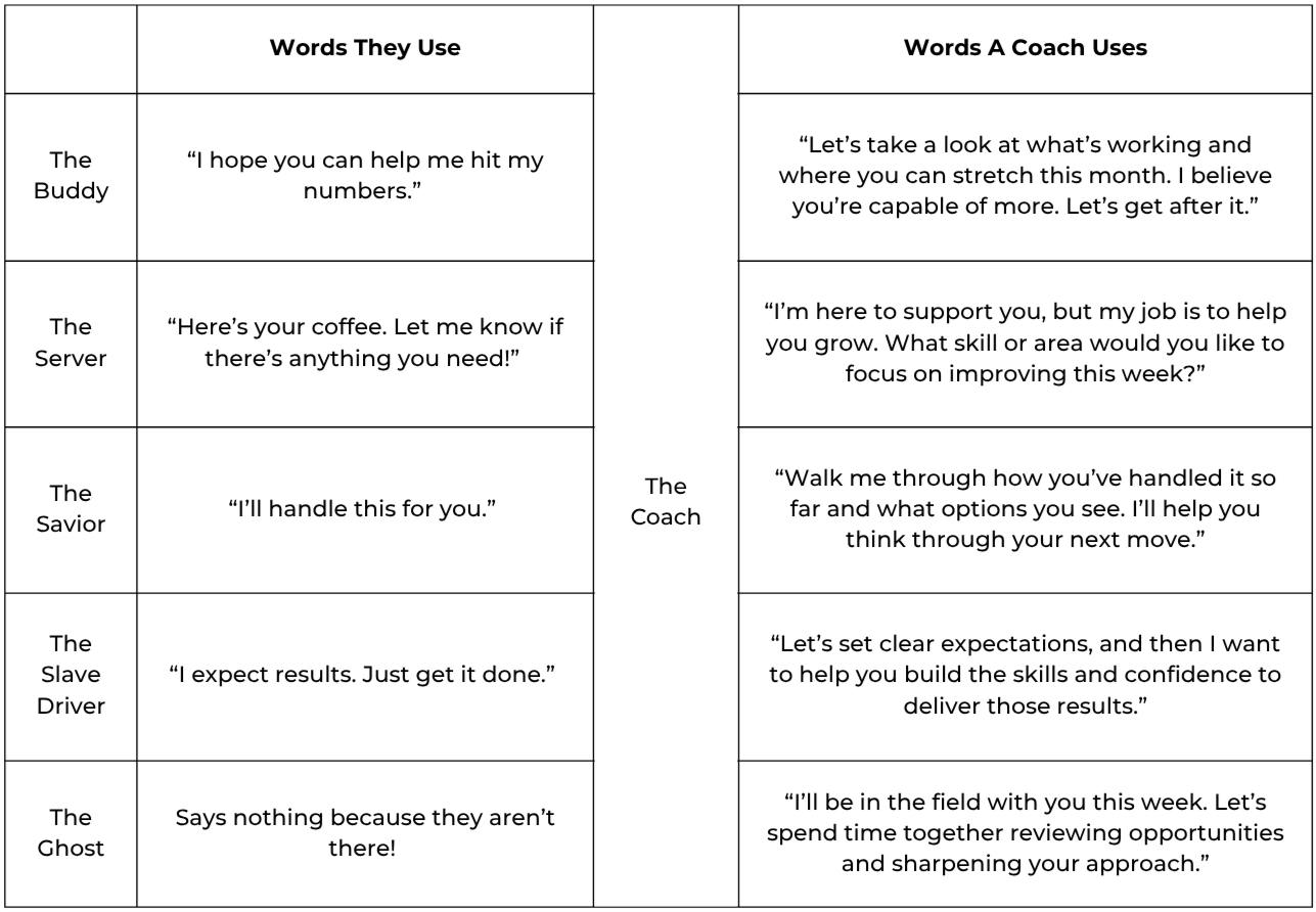 Stan’s voice got quiet, and he replied, “Well . . . no, not really.” I could tell he was embarrassed, and I didn’t want him to feel like I was catching him doing something wrong. I asked him to share why he didn’t really get to any of the coaching sessions. His reply blew me away. He said, “Well, I’d love to coach people, but that’s not really my primary role.” When I asked him to share what he believed his primary role was, Stan said, “To manage processes, open new communities, hire and fire, and set up pricing.”